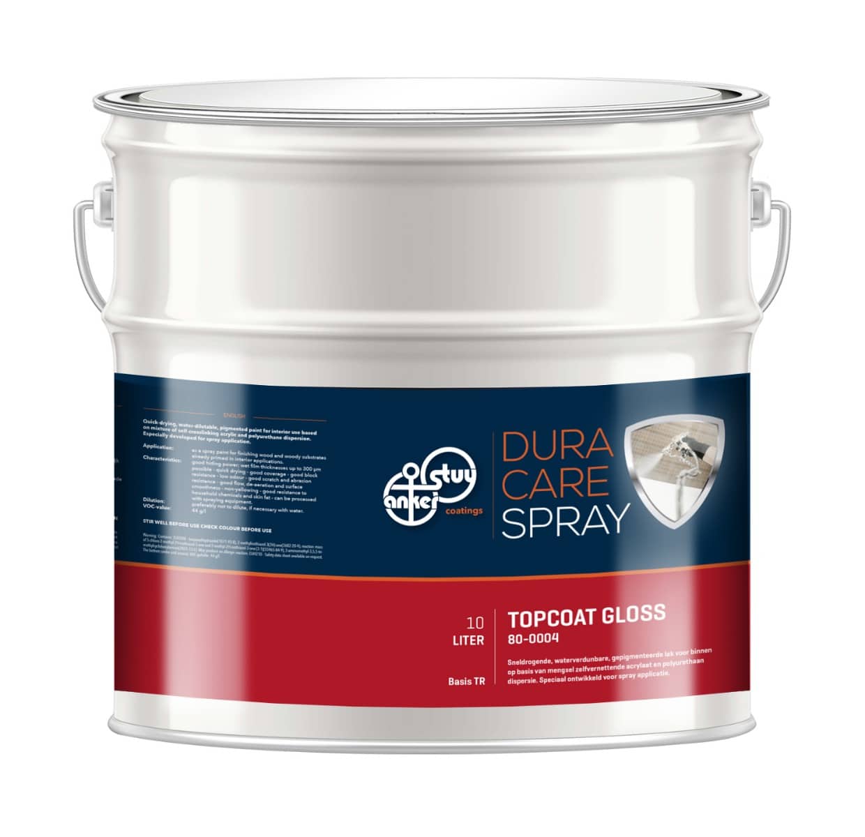 De Duracare Spray Topcoat Gloss is een sneldrogende, waterverdunbare, gepigmenteerde lak voor binnen op basis van mengsel van zelfvernettende acrylaat en polyurethaan dispersie.