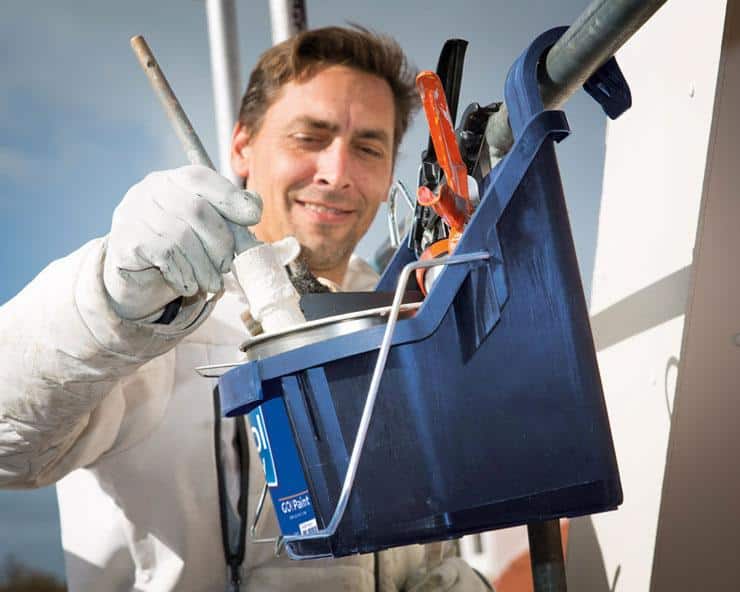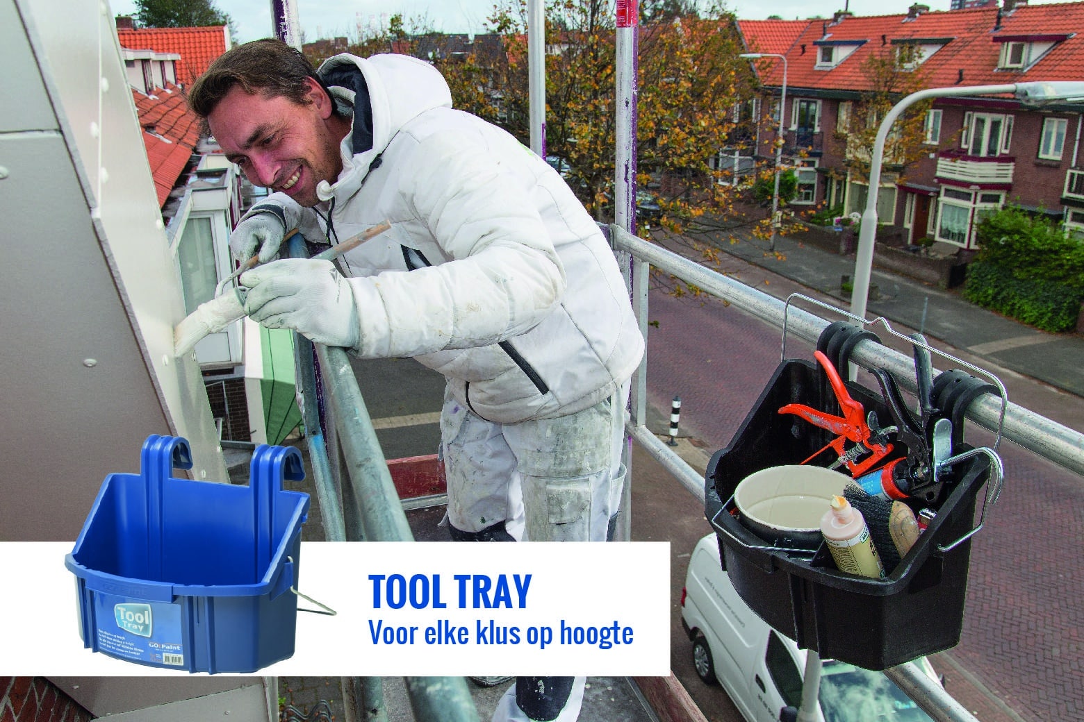De Go!Paint Tool Tray is een handige bak voor verfblikken en gereedschap die eenvoudig te hangen is op een steiger, ladder of hoogwerker. Je hebt daardoor beide handen vrij voor de klus en kan veiliger, sneller en ergonomisch werken.