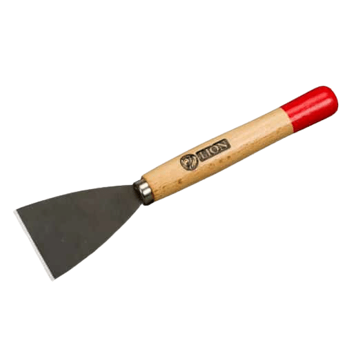 Gehard en geblauwd stalen afsteekmes. Deze blank gelakt houten heft met rode punt afsteekmes wordt gebruikt voor het afsteken van oude lijmresten, behang en verfresten.