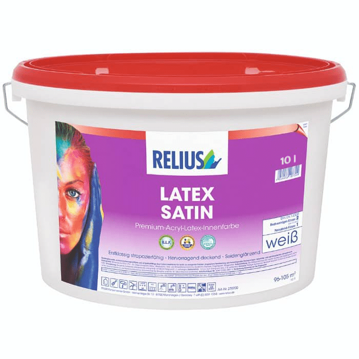Zwaar belastbare en zeer goed reinigbare latexmuurverf voor binnen. Zijdeglanslatex van premium-klasse voor het meest hoogwaardige schilderwerk en alle toepassingen, zoals dokterspraktijken, ziekenhuizen, zorginstellingen, kinderdagverblijven, scholen, kantoren, banken, hotels, woon-, werk- en slaapkamers. Latex Satin is ook buitengewoon geschikt voor wanden en plafonds die aan sterke vervuiling onderhevig zijn en met hoge hygiënische eisen; omdat het verfoppervlak tegen desinfecteermiddelen bestand is. Het materiaal kan gemakkelijk en soepel worden verwerkt. Latex Satin heeft geen oplosmiddelen en weekmakers, is emissiearm, reuk arm, bijzonder waterdamp doorlatend, zeer goed hechtend en spanningsarm.