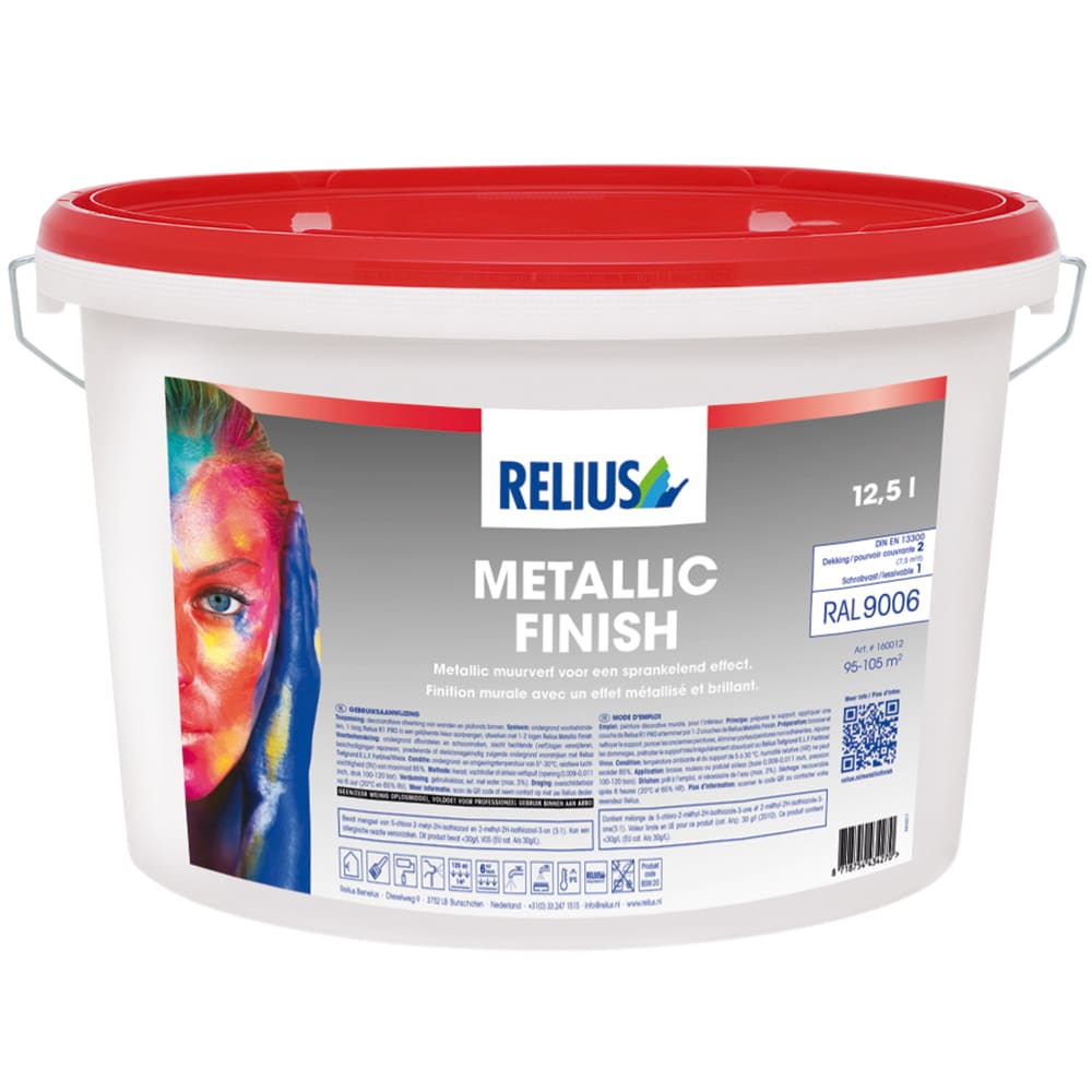 Relius metallic muurverf is een waterverdunbare, goed dekkende en gemakkelijk verwerkbare muurverf op basis van acrylaatdispersie, geschikt voor binnen. Het is geschikt voor steenachtig en betonnen ondergronden en kan ook worden toegepast op glasweefsel