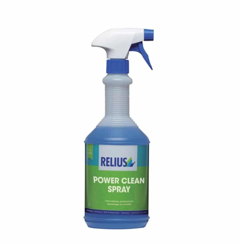 Ontvettingsmiddel Relius power clean spray is een kant-en-klaar ontvettings- en reinigingsmiddel. Het is een vervanger voor ammonia. Dit middel is biologisch afbreekbaar en binnen en buiten toepasbaar. Dit komt doordat het reukneutraal is. Power Clean breekt de moleculaire structuur van de vuil-en vetaanslag af. Dit zonder het oppervlak te beschadigen. Het is geschikt voor het oplossen van organische vervuiling op allerlei niet-zuigende oppervlaktes. Bijvoorbeeld afzuigkappen, keramiek, glas, gelakt houtwerk en autovelgen. Power Clean is uitermate geschikt voor het ontvetten en reinigen van schilderwerk, industriรซle en huishoudelijke verontreinigingen.