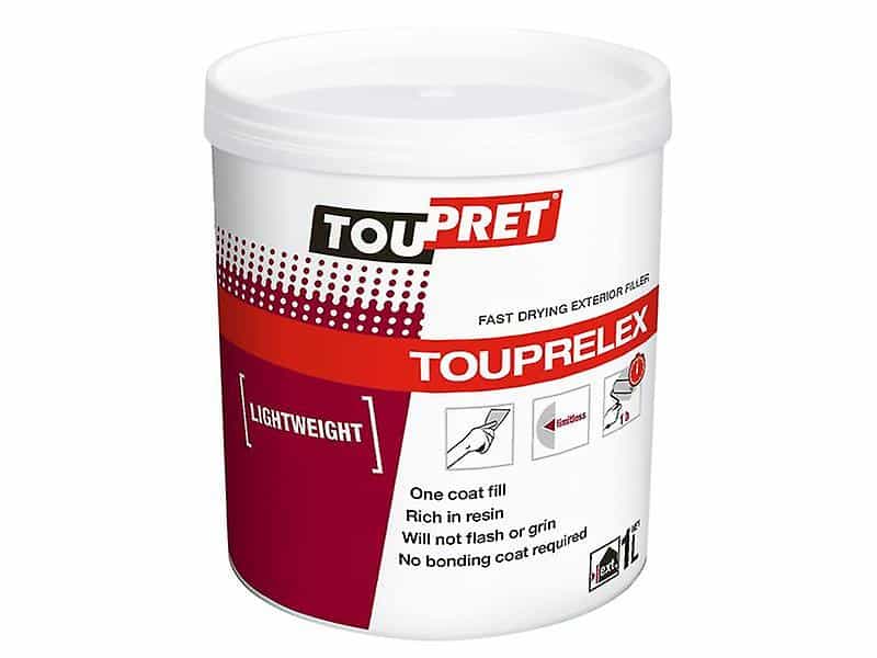 Toupretยฎ TOUPRELEXยฎ Exterior Fast Drying Lightweight Filler wordt kant-en-klaar geleverd. Het biedt een eenlaag te vullen met geen noodzaak om prime spot en geen stabiliserende oplossing of PVA nodig. Deze lichtgewicht vuller is rijk aan hars. Zal niet knipperen of grijnzen. Geschikt voor extern gebruik, kan worden overgeschilderd in 1 uur. Kan worden gebruikt op ongeverfd of geschilderd: gips, oude geschilderde oppervlakken, cement, beton, cellulair beton, windblokken, bakstenen en stenen. Overcoat met alle soorten watergedragen of minerale verven, waterdichte coatings. Bedek niet met epoxyverf op basis van polyurethaan of oplosmiddelen, tenzij deze is geprimed met een watergedragen buitenverf.